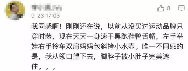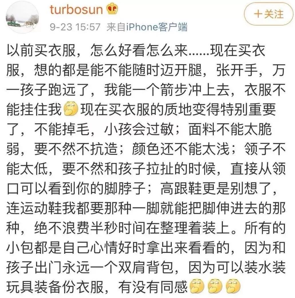 以前买衣服,怎么好看怎么来……现在买衣服,想的都是能不能随时迈开腿,张开手,万一孩子跑远了,我能一个箭步冲上去,衣服不能挂住我。