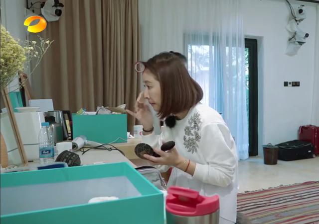 而后在其他成员在做饭时,林心如在化妆: