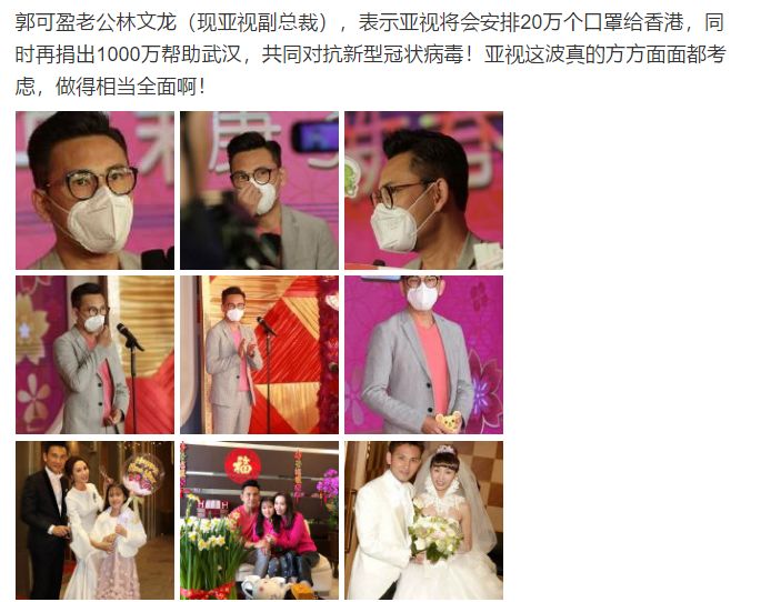 除了韩红之外,还有很多明星和企业为武汉捐款。就在2月1日港媒报道,1月31日亚视举行了新春团拜活动,林文龙以及历届亚姐纷纷现身,大家都戴着口罩做好防护措施,防疫意识非常好。