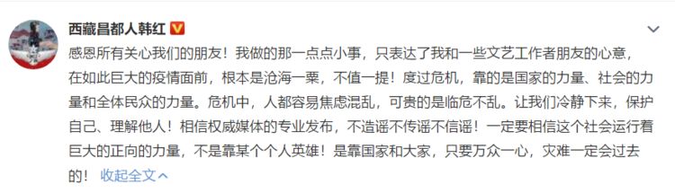 最近一段时间武汉肺炎牵动着全国人民的心,很多网友和明星纷纷伸出援助之手,捐钱捐物助力武汉共同抗灾。其中最受网友称赞的应该就是韩红了,多年来她一直在坚持做公益和慈善,这一次抵御新型冠状病毒时效率高,物资运输快,给医护人员带来了很大帮助。
