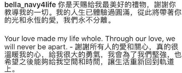 当晚Bella在社交平台上晒出了与高以翔的合照,并发文悼念。Bells说道:你是天赐给我最美好的礼物,谢谢你教导我的一切。我的人生已体验过圆满,从此将带着你的光和永恒的爱,我们永不分离。同时,她也感谢了朋友家人的关心:谢谢所有人的爱和关心,真的很温暖我的心,给我很大的勇气,我会为了我们坚强,也希望之后能够给我空间和时间,让生活重新回到轨道上。