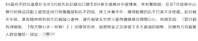 2019年对于任达华来说是多灾多难的一年,先是2019年3月份时在红隧出口发生的4车交通意外中被撞车,但幸好有惊无险没有受伤。但2019年7月任达华就没那么幸运了,任达华在参加一个活动时,被歹徒用刀刺伤腹部和右手四指,停工休养了差不多半年的时间。
