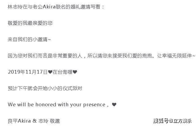 近期有人贴出了林志玲的婚礼邀请函,文风还是一如既往地嗲,看来应该是林志玲亲笔。据说林志玲这次相当大方,不收礼金只要礼物,这让那些借婚礼敛财的明星瞬间遁于无形。而台湾名嘴蔡康永到时会亲自担任司仪,志玲姐姐的婚礼免不了会变得欢声笑语。