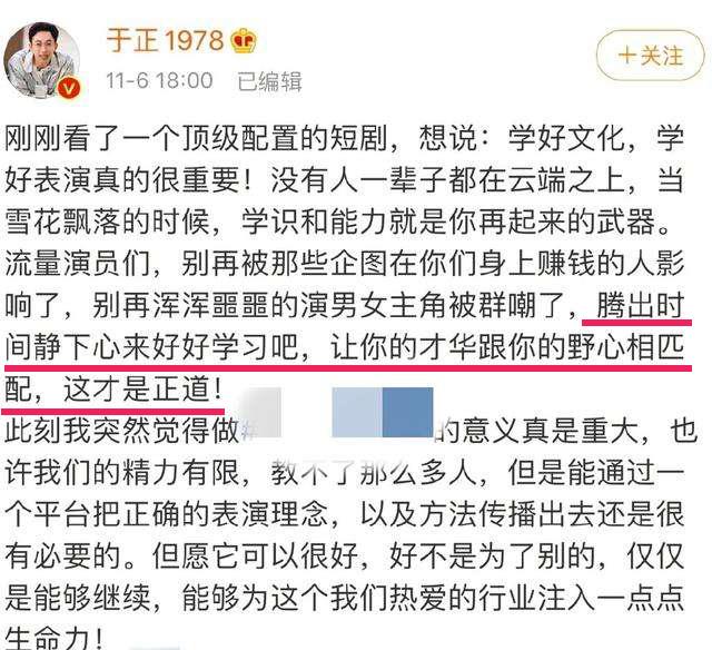 比如前段时间于正发表在社交媒体上的“劝流量学习”的长文,他的 “静心学习,让才华和野心相配”的观点就收获了不少网友的点赞。