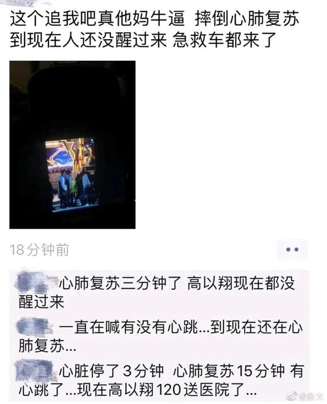 据现场工作人员说,吴宣仪被当场吓哭,陈伟霆双手合十祈祷,高以翔因为超前工作,连续17个小时没有休息,累倒在地,直呼:“不行了,不行了!”接着晕倒,工作人员为起做了心肺复苏3分钟,并不见好转,才被迫送往医院,黄景瑜见状宣布不录了。