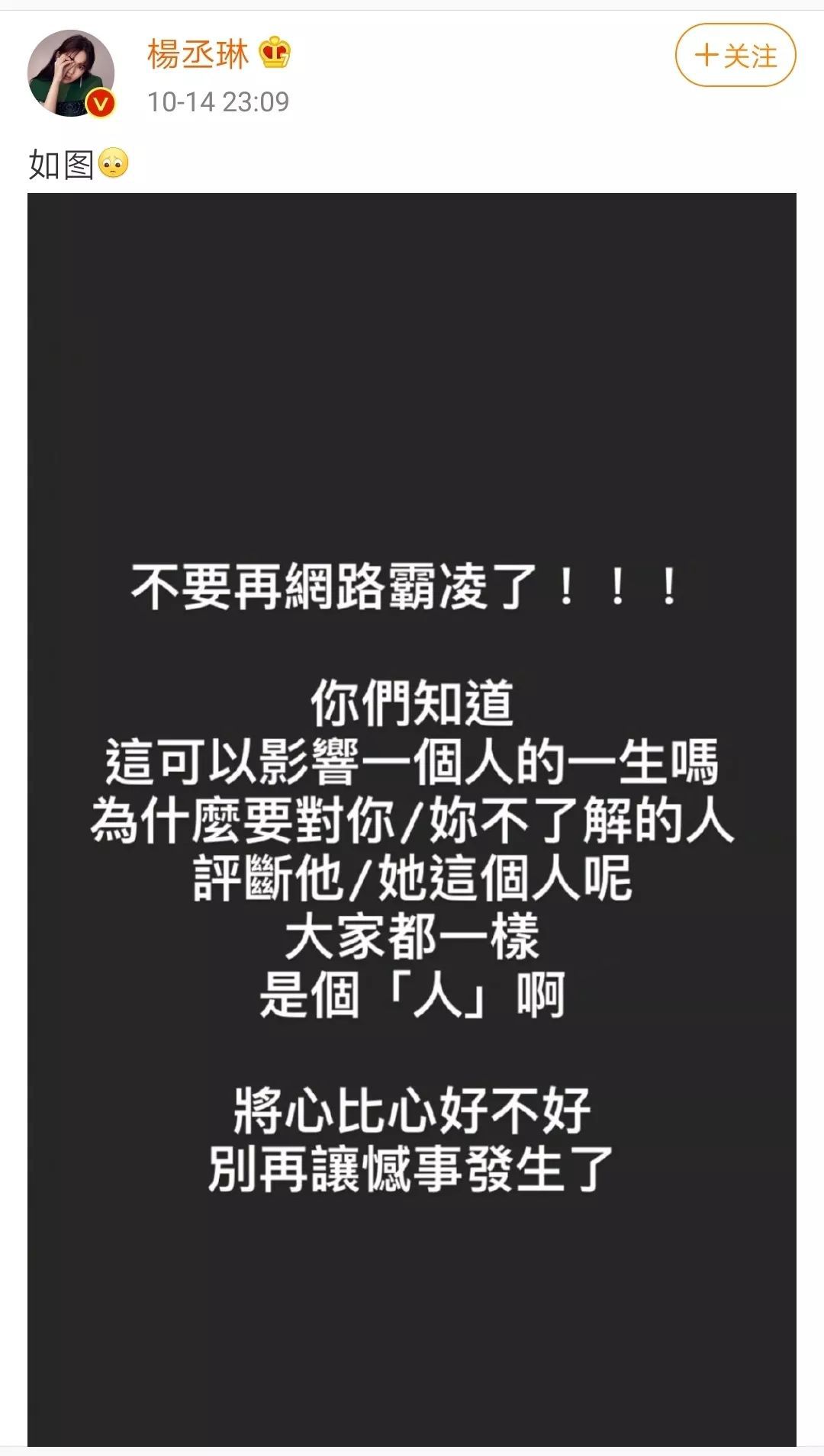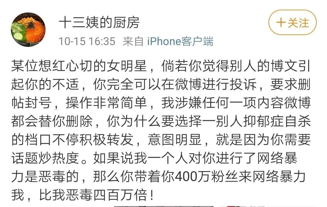 “键盘侠”们不负责任的言语,落在别人身上可能就会是一把直插心口的刀子。诚然,明星需要更大的心理承受能力,但是天天这么白刀子进红刀子出的,谁能受得呢?