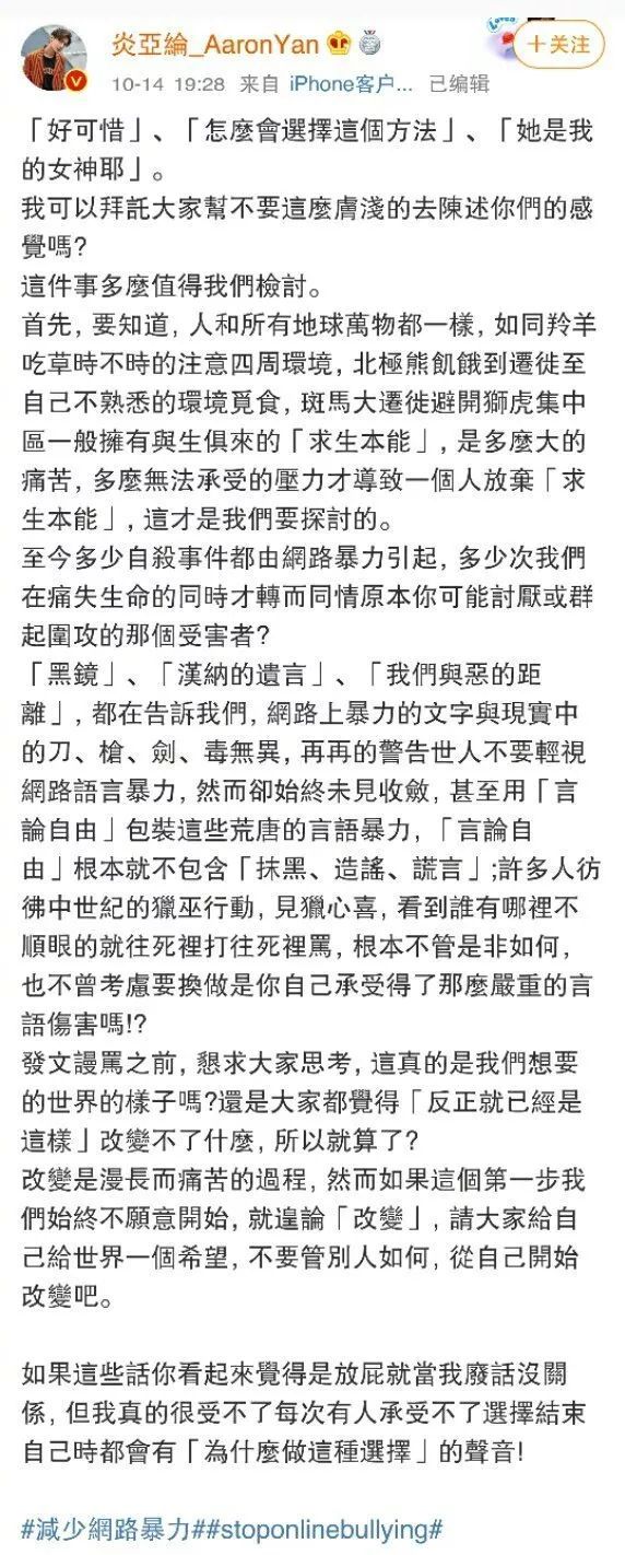 雪莉的离世又一次给大家敲醒了警钟。杨丞琳、沈梦辰、炎亚纶等艺人都发声斥责网络暴力。