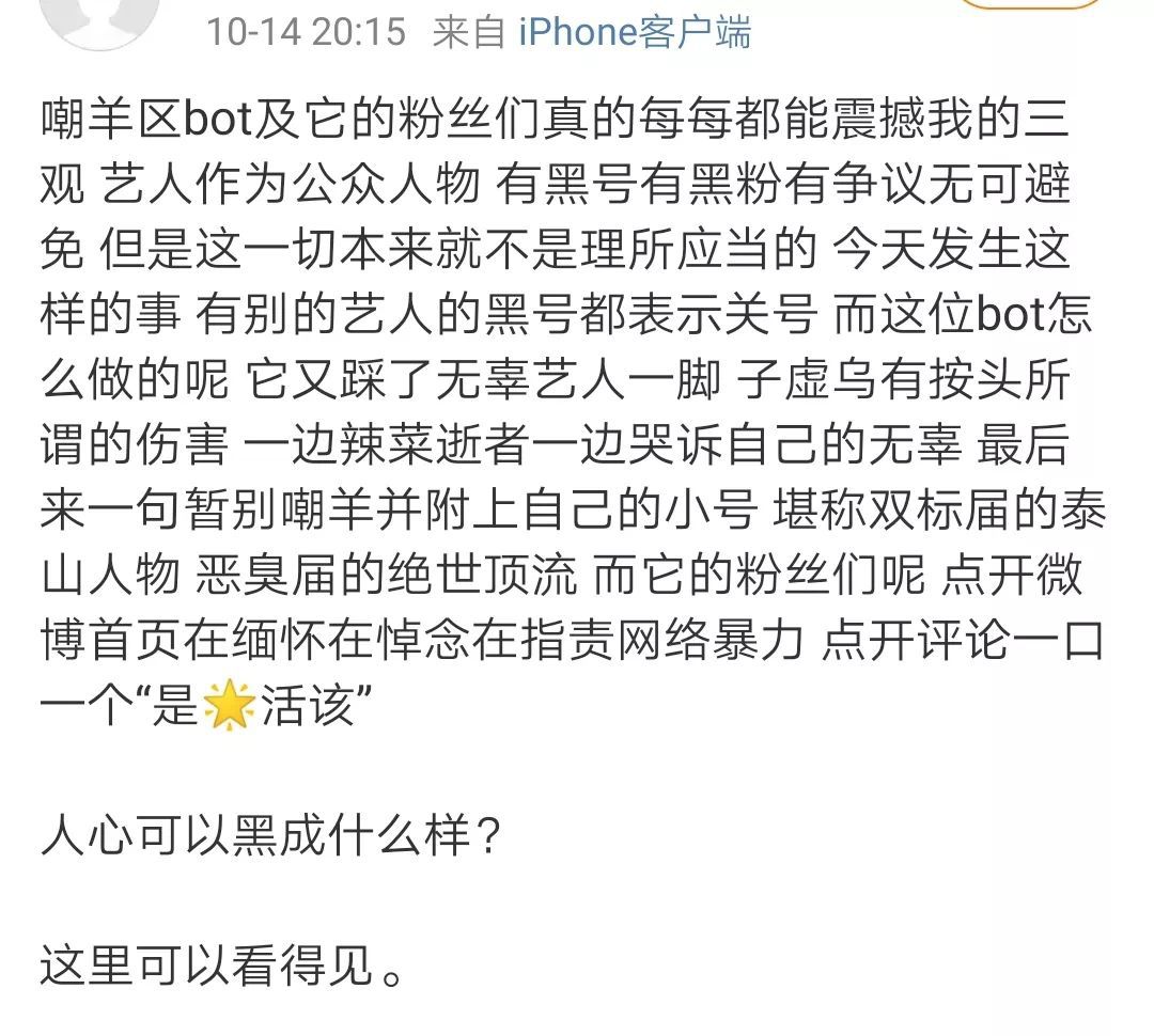 然而黑粉的可怕底线是常人所难以想象的。只要一个人想黑你,那么你的每一个行为都能够成为黑粉恶意解读后生产成的黑点。