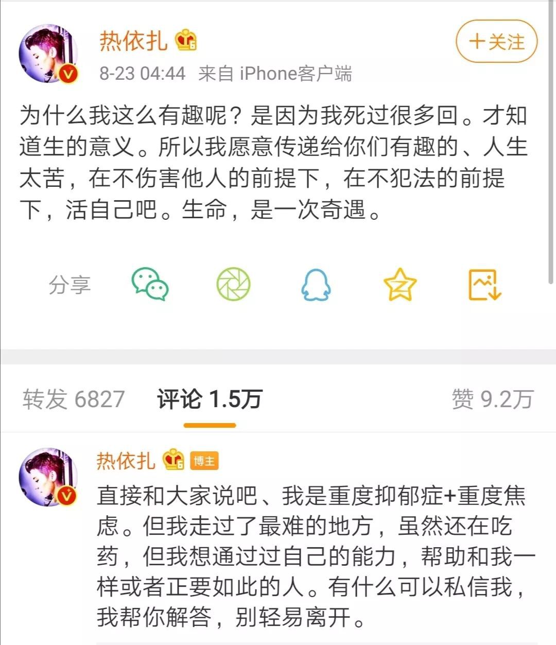 不久后,热依扎自曝患上抑郁症,但仍然表示乐观面对生活。面对穿衣争议,她直言穿衣不该成为话题,坦荡的态度也让人称赞。