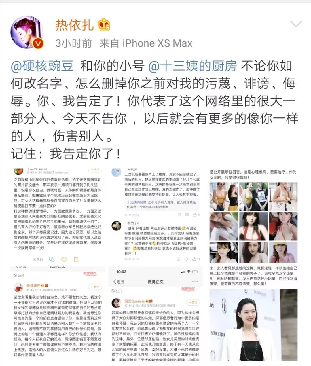 原标题:忍无可忍,热依扎挂造谣网友,网络暴力何时