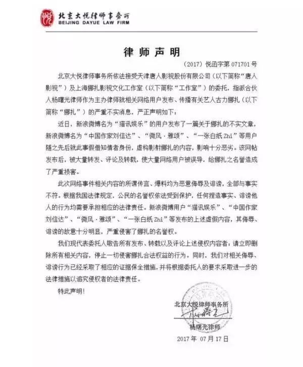 对于网络暴力,不少明星都选择用法律手段维权。2017年,娜扎工作室就曾发表声明谴责恶意造谣行为。