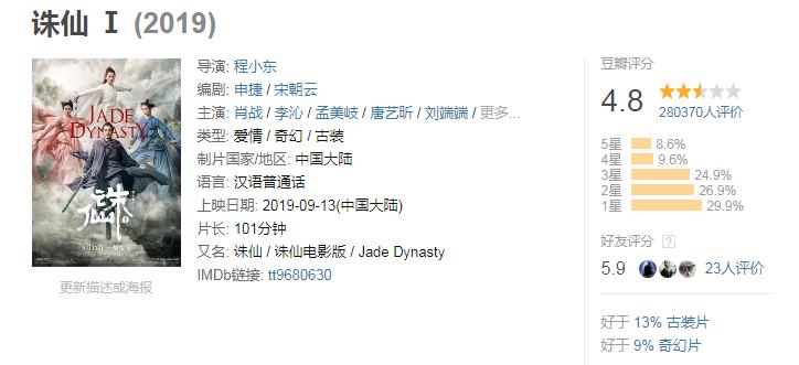 《诛仙1》是武术指导程小东执导的一部电影,因为是肖战和孟美岐主演,票房4亿多,但豆瓣评分却只有4.8分。