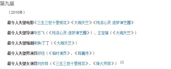 不过很多人电影人都没有亲自去领奖,除了王宝强,第九届王宝强凭借导演的贺岁片《大闹天竺》获得最令人失望电影、导演、编剧等三个大奖,王宝强亲自去领奖,显得很是大度,他领取这个奖,不仅没有被嘲笑,反而被好评,因为大家都认为王宝强有勇气、有担当,正视自己的不足,可能他领了这个奖后,不太可能还会再当导演。其实不少跨界当导演的演员曾被金扫帚青睐,比如高晓松、郭敬明联系蝉联两届、何炅、张嘉佳等,但他在线电影院们都没有像王宝强一样勇气十足的领取这个奖。