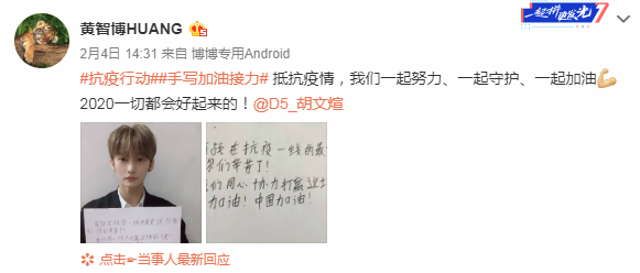 更让人觉得滑稽的是,这位黄智博,还在微博上更新了为武汉加油,为医护人员加油的内容。