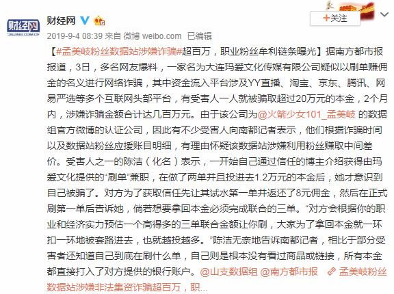 可此前该公司旗下艺人孟美岐的粉丝数据组团队,就涉嫌过有组织层面的诈骗事件。