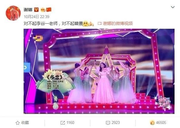 昨天深夜10点多,谢娜突然在微博上发文,公开道歉:对不起李谷一老师,对不起碧晨。