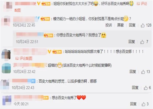 果然网友看到这个视频之后,纷纷在留言表示:谢娜模仿能力一绝,好怀念《百变大咖秀》啊。《百变大咖秀》当年可是给小扒带来了无数的欢乐和笑点,不知道有生之年还能不能等到这档节目复播呢?