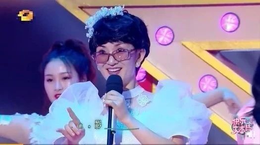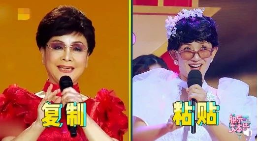 充满年代感的黑卷短发,棕色深框眼镜,同款大袖蓬蓬裙,谢娜几乎一比一还原了李谷一老师在台上的经典装扮,一样端庄的摆手动作,连眼神方向都一模一样,简直就是复制粘贴式的模仿。