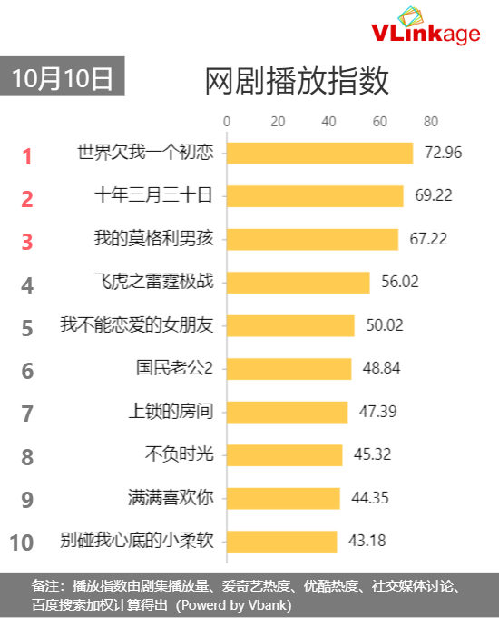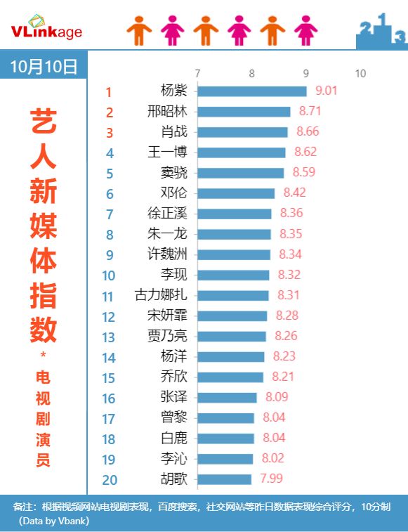 原标题:Vlinkage榜单 | 10月10日网播数据及艺人新媒体