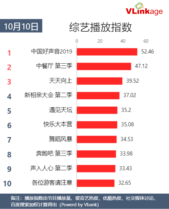 【综艺榜单】10月10日当日#综艺播放指数#:1.#中国好声音2019#播放指数 52.46 2.#中餐厅 第三季#3.#天天向上#4.#新相亲大会 第二季#5.#遇见天坛#6.#快乐大本营#7.#舞蹈风暴#8.#奔跑吧 第三季#9.#声入人心 第二季#10.#各位游客请注意#