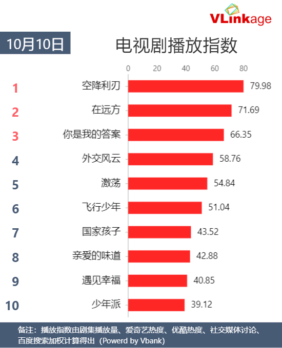 【纬岭榜单】10月10日当日#电视剧播放指数#:1.#空降利刃#播放指数 79.98 2.#在远方#3.#你是我的答案#4.#外交风云#5.#激荡#6.#飞行少年#7.#国家孩子#8.#亲爱的味道#9.#遇见幸福#10.#少年派#