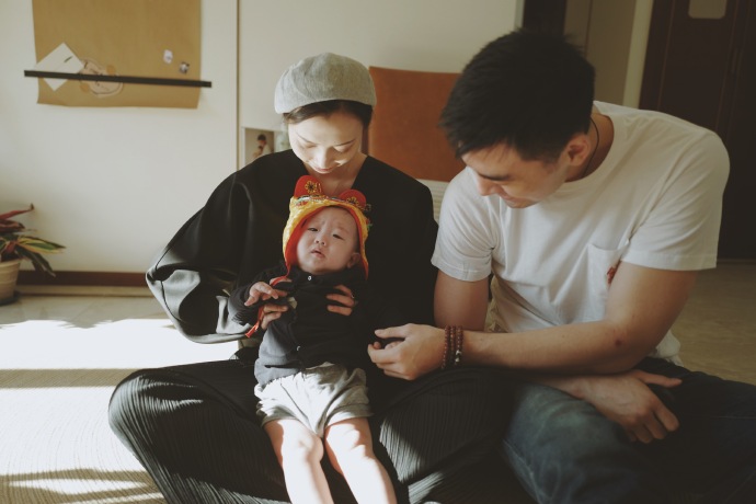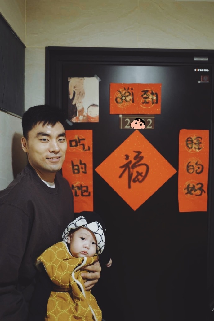 辽篮内线大将李晓旭和妻子李旭在自己家了过年,李旭抱着儿子,李晓旭在旁边逗儿子玩。李晓旭还抱着儿子在门口合影留念,他家门口的春联贴的还挺有意思:“吃的饱,睡的好”。