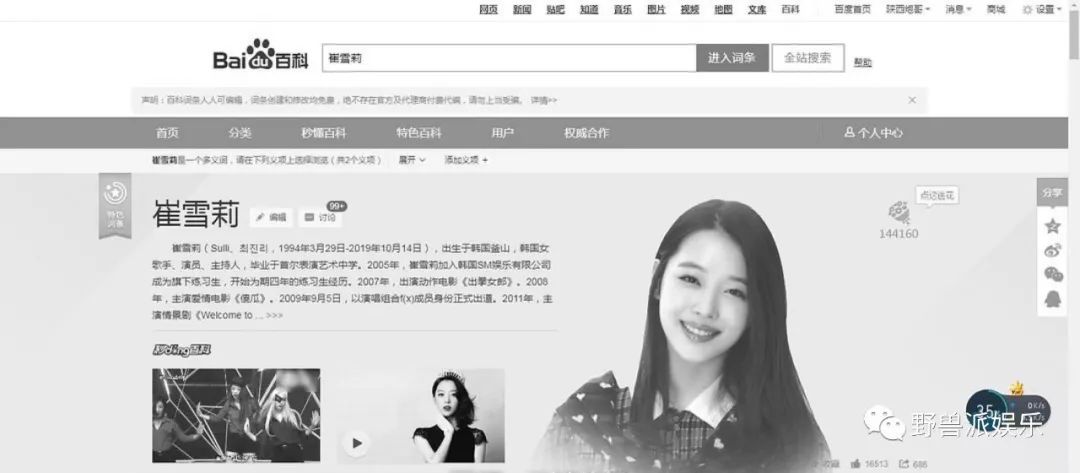 雪莉的百度百科也瞬间变成了黑白色。