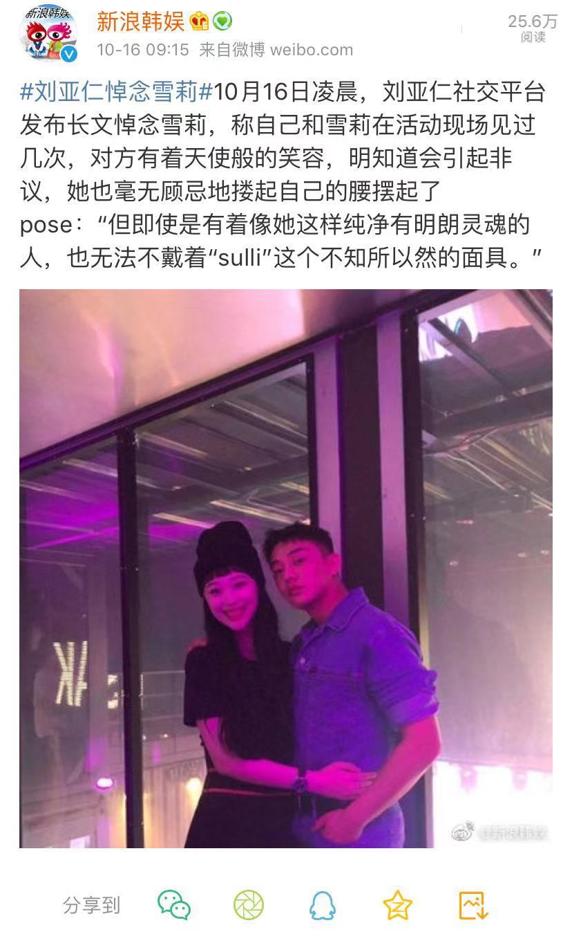 同样曾患抑郁的刘亚仁在社交平台发文悼念崔雪莉,称自己和对方没见过几次,但对方有着天使般的笑容,明知道会引起非议,但崔雪莉毫无顾忌的搂着刘亚仁的腰摆起pose,说“但即使是有着像她这样纯净有明朗灵魂的人,也无法不戴着sulli这个不知所以然的面具”。