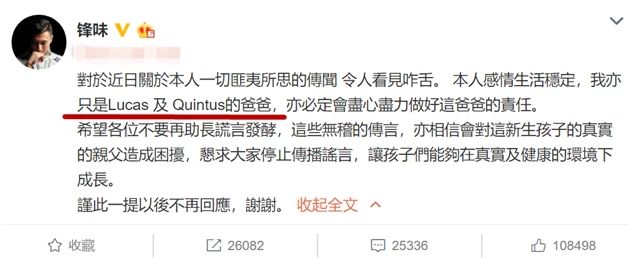 当张柏芝生下三胎,谢霆锋被猜测是生父时,他还发了微博澄清了此事。那句“感情生活稳定”无疑不是在昭示自己和王菲过得很好。