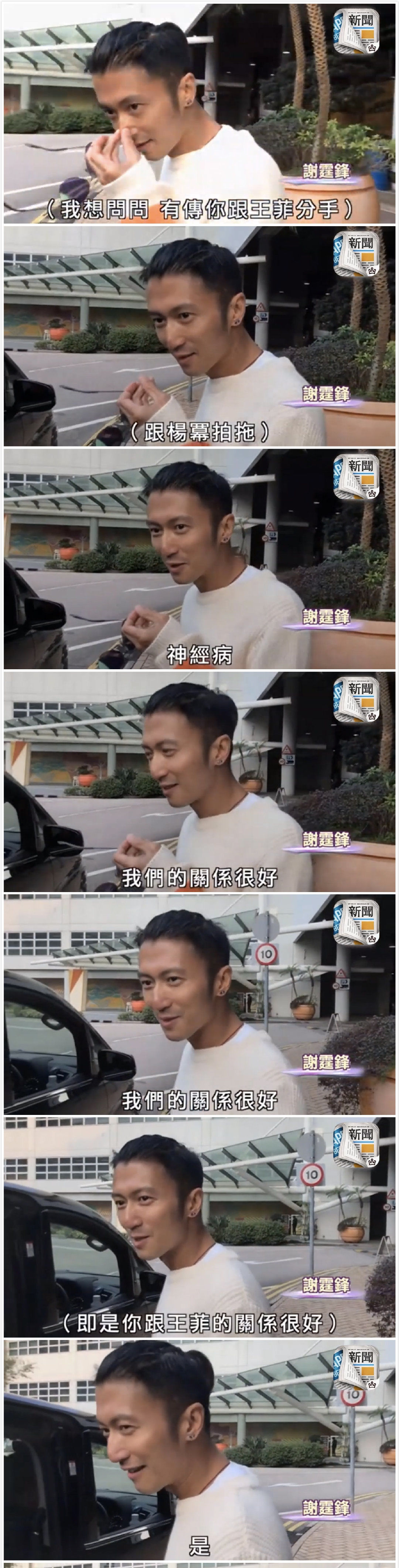 被问到是不是与王菲分手跟杨幂拍拖,谢霆锋直言神经病,还笑着说自己和王菲关系很好。