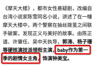 在剧中,baby扮演的是第一季的“剧情女主角”,全剧的主角,是杨子姗和郭涛。