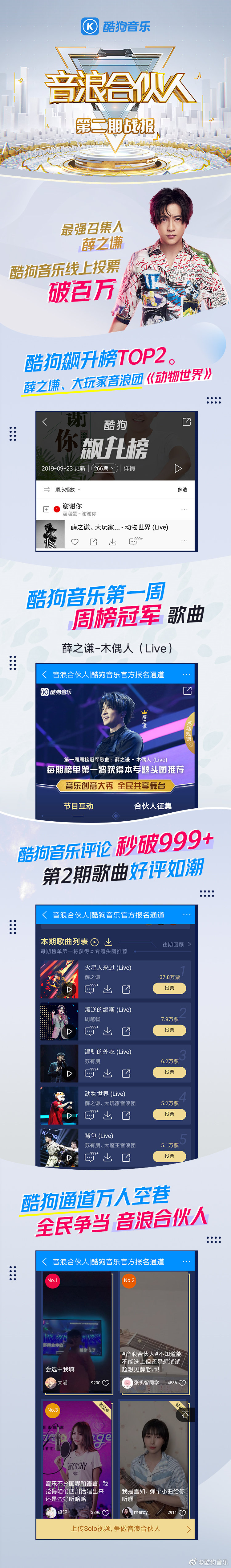 《音浪合伙人》第二期战报新鲜出炉,薛之谦斩获百万投票,成为本期最强召集人!第一周周榜冠军歌曲同步揭晓,恭喜薛之谦的《木偶人》喜提专区头图。歌曲上线后光速收割999 评论。果真认真做音乐的男人真的会有回报。