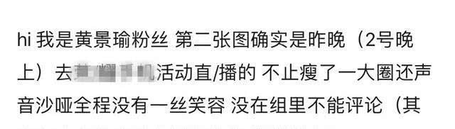 在高以翔事发后,其他同期的录制嘉宾都深陷悲痛难以置信,陈伟霆、宋祖儿等人更是在社交平台上怀念高以翔。作为看着高以翔不幸发生的黄景瑜,在其离世后立马取消了和粉丝约定好的生日直播,再没有发过声,更是没有看到过他的身影。就在事发7天后,12月2日黄景瑜现身为某活动站台,一身皮衣的他看起来酷劲十足,但脸色却非常憔悴,两颊凹陷,黑眼圈也非常重,状态非常不好。