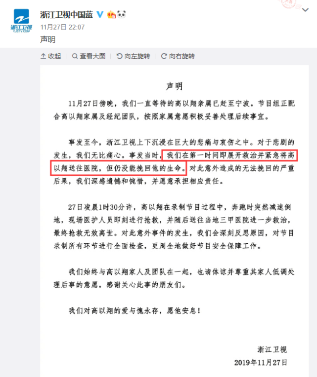 11月27日,高以翔在录制综艺《追我吧》时不幸离世,而作为同期的录制嘉宾,黄景瑜和陈伟霆等人也是亲眼见证了这一过程的发生。尽管浙江卫视和《追我吧》节目组连续发了声明,表示在高以翔发生意外后立马进行了救治。但从现场观众和网友的深挖中,这些声明也有太多的漏洞。