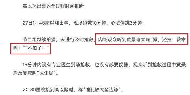 根据现场观众的发文和大V的时间截点证明,网友也大致对高以翔事发过程做了推断,认为节目组对于高以翔的救治肯定错过了“黄金四分钟”。如果救治及时的话,黄景瑜不会当场罢录和爆粗口。