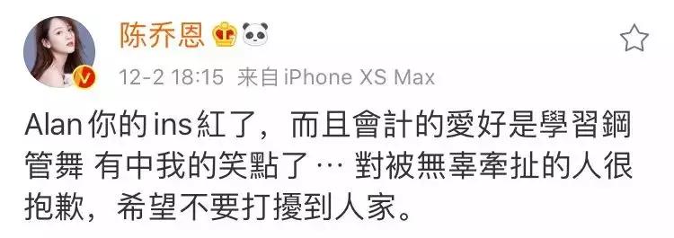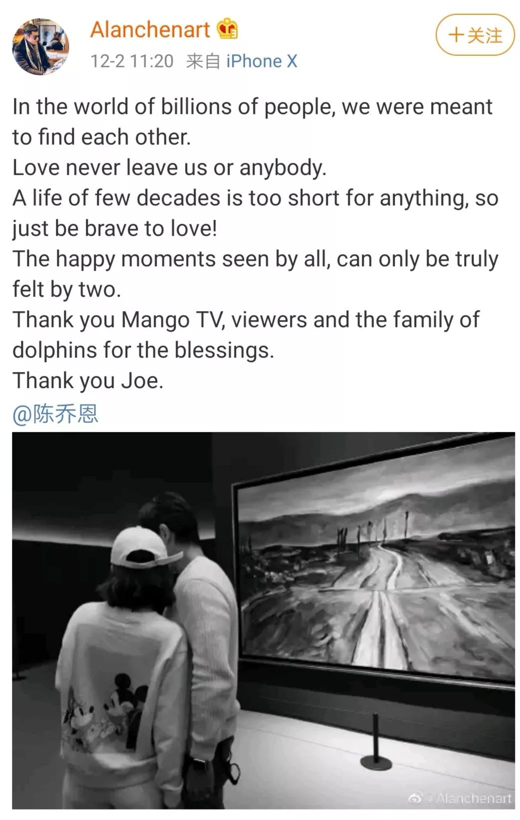 可谁知,就在这话题快要被淡忘的三天后,也就是12月2日早上,陈乔恩本人亲自在微博发出了“恋爱宣言”: