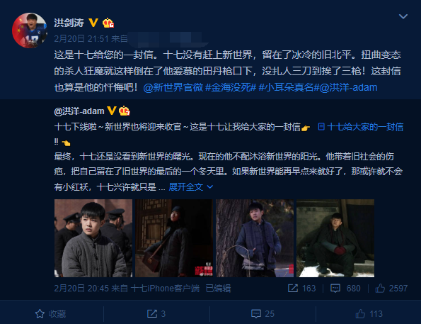 洪洋也曾很苦闷,不过他没有放弃,今次获徐兵导演赏识,出演了“十七”一角,虽为配角,却成为贯穿整部剧故事线的重要人物,也是很多人追剧的动力,“小红袄是谁”多次上热搜,而洪洋用自己的演技,将该角色诠释得非常到位,不仅获得同行认可,也得到网友夸赞,更为父亲洪剑涛长了脸。