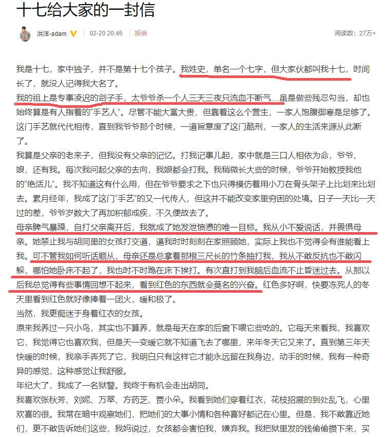 身负多条人命,十七死有余辜,但是从某种意上来说,他又很可悲和可怜,因为童年阴影,导致心理扭曲,某一次遭母亲虐打,脑后血流不止昏迷过去,此后每当看到红色的东西,他就会莫名兴奋,这就是他专杀穿红袄女人的原因,至于他的刀法为何如此娴熟,皆因为他得到了祖传,因为他的祖辈是专事凌迟的刽子手。