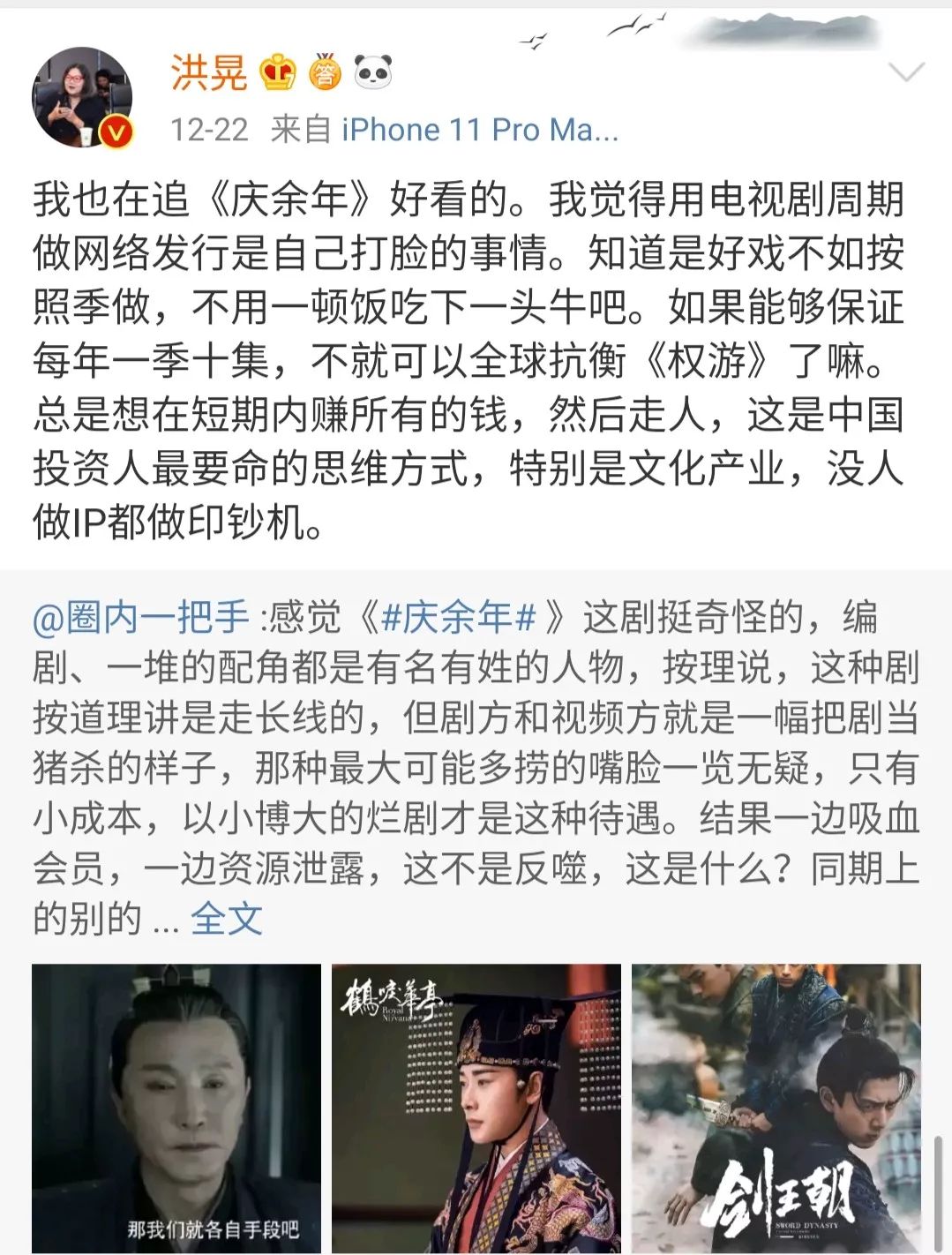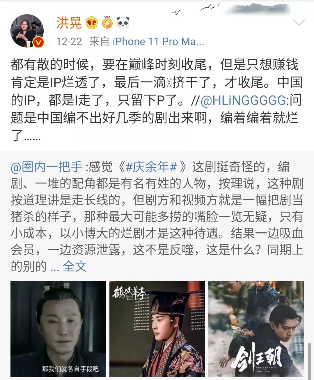 《庆余年》的热播在年底献上了一波不少的话题量,穿越+权谋的搭配深受观众喜爱,随着剧集的更新,观众深陷剧情不能自拔,而《庆余年》的播放方式却让剧迷们不满,近日陈凯歌前妻洪晃在个人平台上发长文吐槽《庆余年》,洪晃称自己表示也是《庆余年》的剧迷,但在巅峰时刻的收尾,在电视剧周期中做网络发行是打脸的事情,榨干观众的期待值,赚满钱拍屁股走人IP巨制走了I只剩P,言辞犀利却得到引起观众广泛共鸣获网友大力支持!