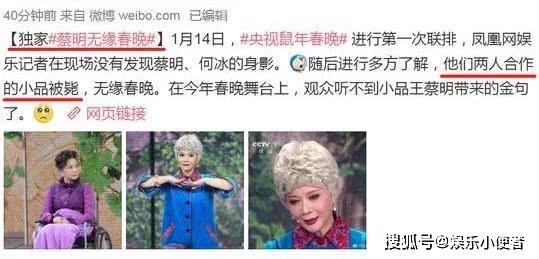 1月14号是央视春晚的第一次彩排,就在央视春晚的节目紧锣密鼓地练习着的时候,一条新闻受到亿万人的关注。蔡明和何冰两人的小品被央视春晚毙了。这条消息可谓是伤了大家的心,要知道,蔡明可是从1990年就开始登春晚演小品。大家对蔡明的第一印象就是春晚小品的代言人。