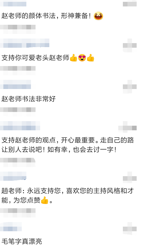网络上对赵忠祥的评价褒贬不一,各种新闻全网乱飞,作为当事人,赵忠祥不甘被诋毁无休止谩骂,他终于还是出面对“写字风波”作回应了。10月19日,赵忠祥在社交平台发动态回应传闻,大致意思就是他从小到大,就格外喜欢写字,他讲述了自己对书法多年来的感情,连说话都是一股文绉绉的味道,隔着屏幕都可感受到他的文人气息,不愧是一代艺术家了。