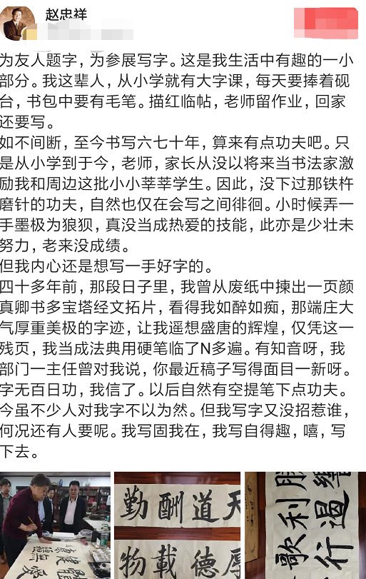 赵忠祥还大方晒出众人围观他写字的照片,以及他的一些文字作品,看上去很不错的样子,这是在向大家展现自己的才华魅力啊!