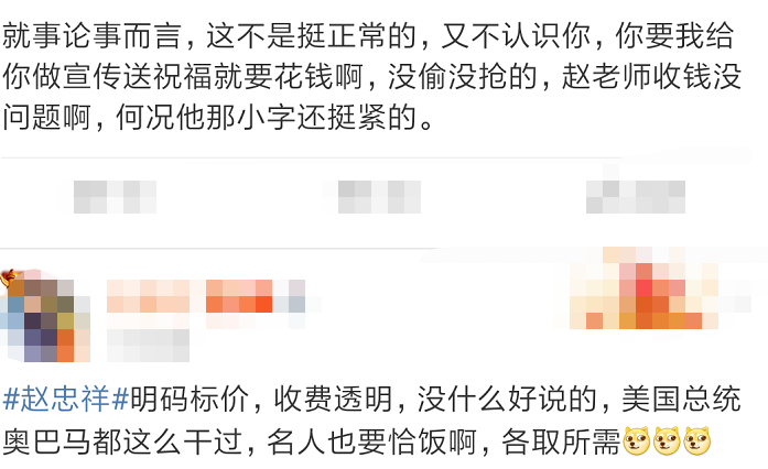 当然了,也有一些人虽然不支持赵忠祥捞金的行为,但也表示可以理解,毕竟谁都有家庭,谁都要生活,别人找他写字拍视频,理应得到响应报酬,总之,赵忠祥如今正处于风口浪尖之处。