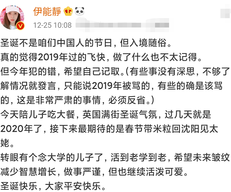 12月25日,伊能静在社交平台分享近照,并表示自己要入境随俗。原来伊能静为了这次圣诞,特意跑到了英国,与儿子哈利欢度圣诞,陪伴即将步入大学的儿子吃了一顿大餐,她更是感慨一番,期待新年的到来。伊能静可没因为陪儿子就忘了女儿,她还说今年过春节要带米粒回家见太姥。