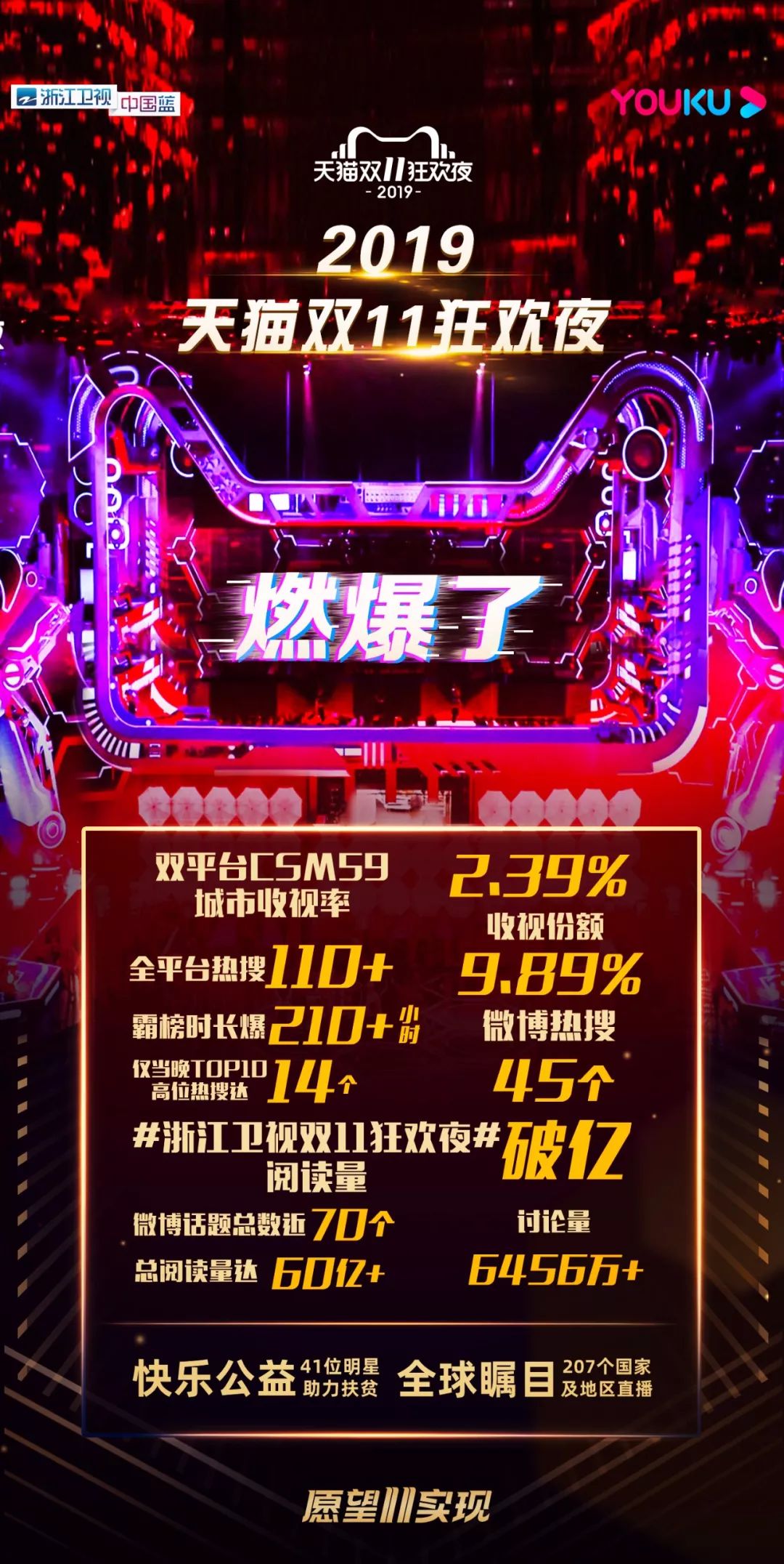 周日2019天猫双11狂欢夜,双平台综合收视CSM59城市收视率2.39%夺冠,市场份额9.89%,同比去年涨幅38.2%,微博热搜45个、全网热搜110+引爆社交媒体,跨界营销晚会再攀高峰,浙江卫视超级晚厂牌闪耀出道。