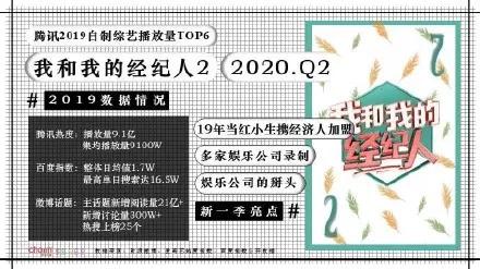 在各大平台2020年招商的名单中,职场元素的综艺也依然存在。《我和我的经纪人2》将从不同公司选取不同艺人及其经纪人,参加节目;观察类真人秀《跟着老板去团建》,将记录老板与员工外出“团建”的全过程。