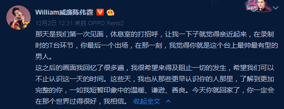 2号,陈伟霆作为同时参加录制的嘉宾,在微博上发表了长文表达对高以翔逝去的遗憾。不过,陈伟霆说到底也是这个节目的被动参与者,相信对于高以翔的离去,他错愕之余也无能为力。