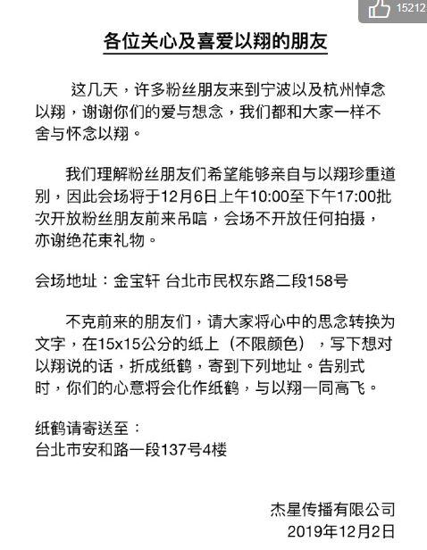 为了能让粉丝见到偶像最后一面,高以翔的葬礼将进行公开吊唁,粉丝可以在12月6号前往灵堂,不能拍摄也不用带花束,最后安安静静的和高以翔告别。