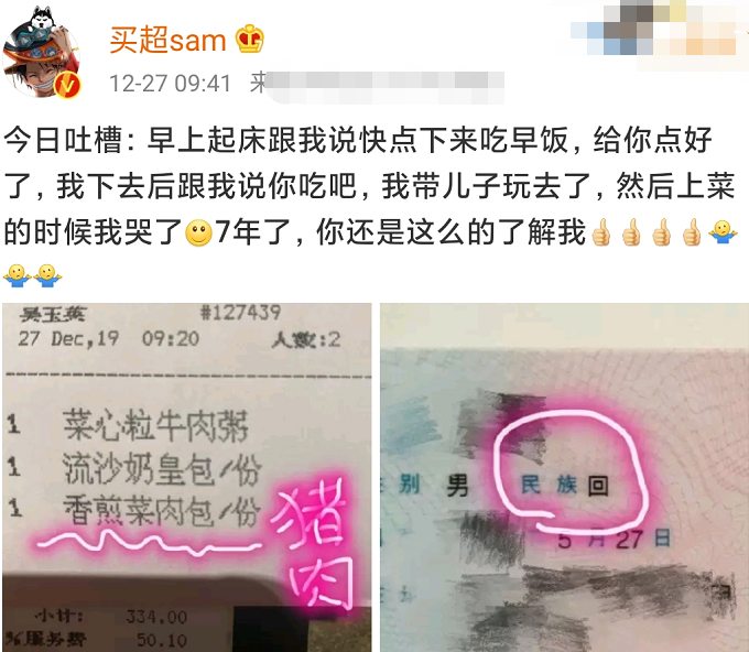 买超这次是铁了心要“吐槽”一下张嘉倪了,他特意晒出两张图片,其中一张是点餐的单子,买超故意提示早餐含中有猪肉,另外一张是他的有效身份证件,两张图片对比来看,就知道为何买超想哭了。