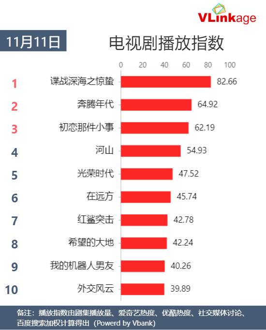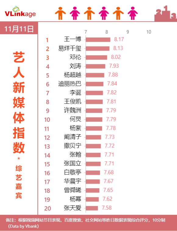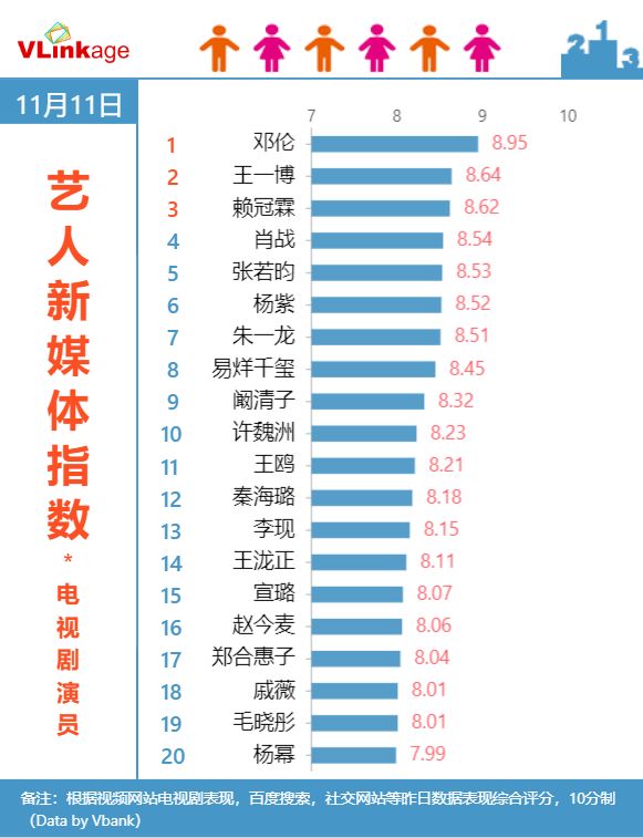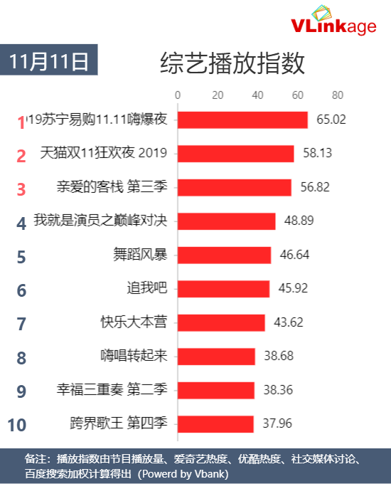 原标题:Vlinkage榜单 | 11月11日网播数据及艺人新媒体